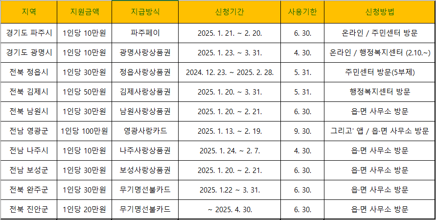 - 신청 기한 준수 : 각 지차제 마다 신청 기한이 모두 다릅니다. 신청 마감 기한이 지나면 지원금 지급이 어려우니 기한을 꼭 지켜서 미리 신청하시기 바랍니다.